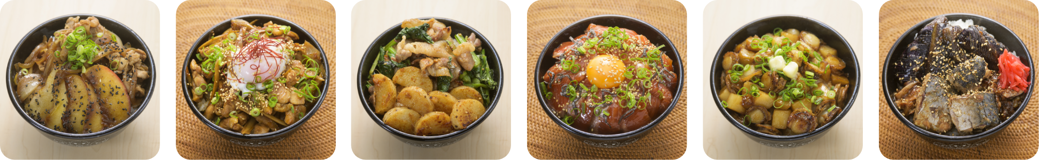 丼にごはんを盛り、④をのせて、最後に黒ごま、ねぎを散らして完成。
